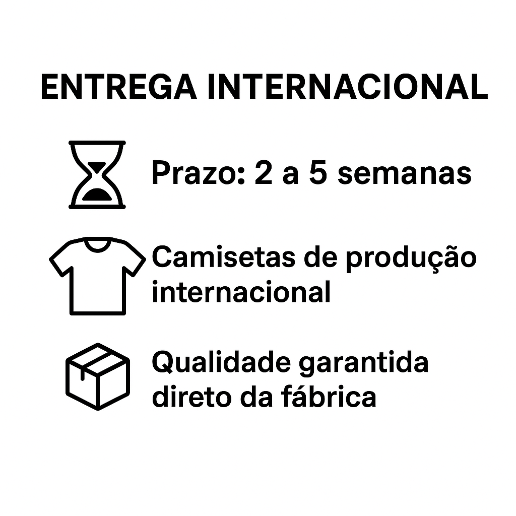 Nossas camisetas são produzidas fora do Brasil, com fornecedores selecionados por sua qualidade e custo-benefício. Por isso, o prazo de entrega estimado é de 12 a 28 dias úteis.